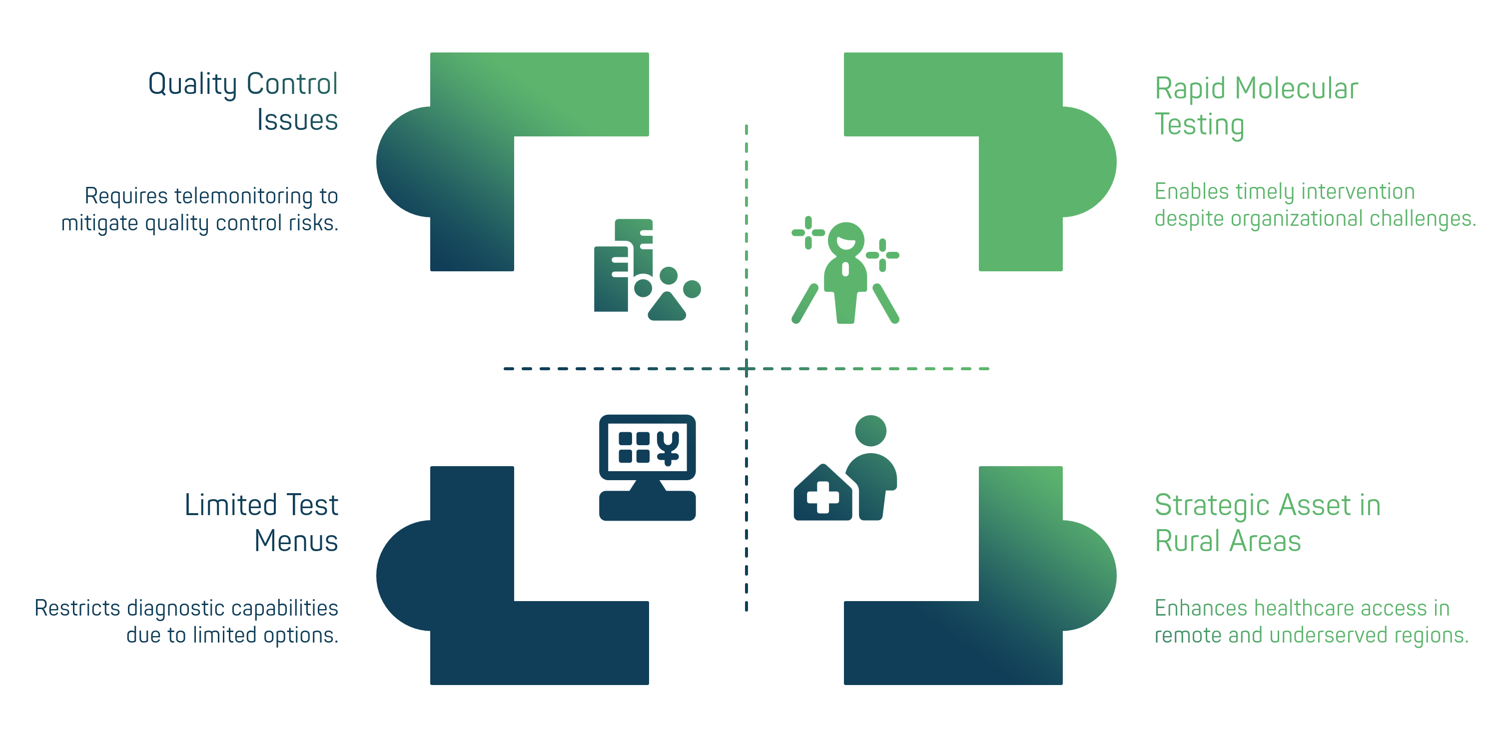 - Diagnostica distribuita: architettura diagnostica decentralizzata che consente di eseguire test direttamente in prossimità del paziente (clinica, laboratorio periferico, siti remoti), mantenendo un collegamento attivo con il laboratorio centrale per controllo qualità, raccolta dati e supervisione.